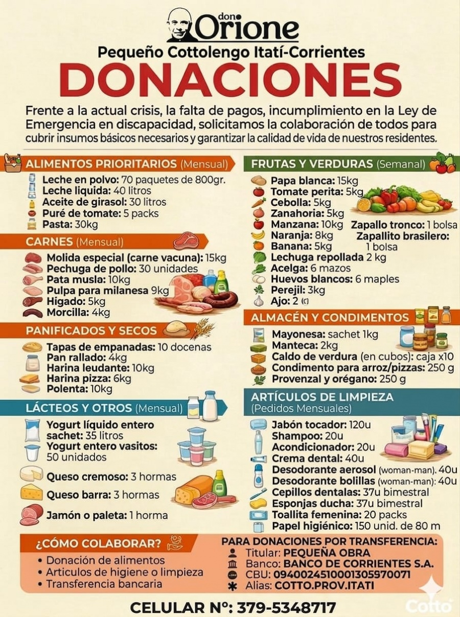 El Gobierno de Corrientes decidió asistir de manera urgente al Cottolengo Don Orione de Itatí, tras la interrupción de fondos nacionales provenientes de PAMI e Incluir Salud, una situación que dejó al borde del colapso a la institución que alberga a 37 personas con discapacidad.