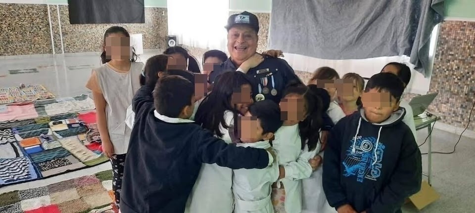 Jorge Omar Raileff, rodeado de chicos, en una charla sobre Malvinas que brindó en Río Mayo. Gustavo Salazar (ADNSUR)