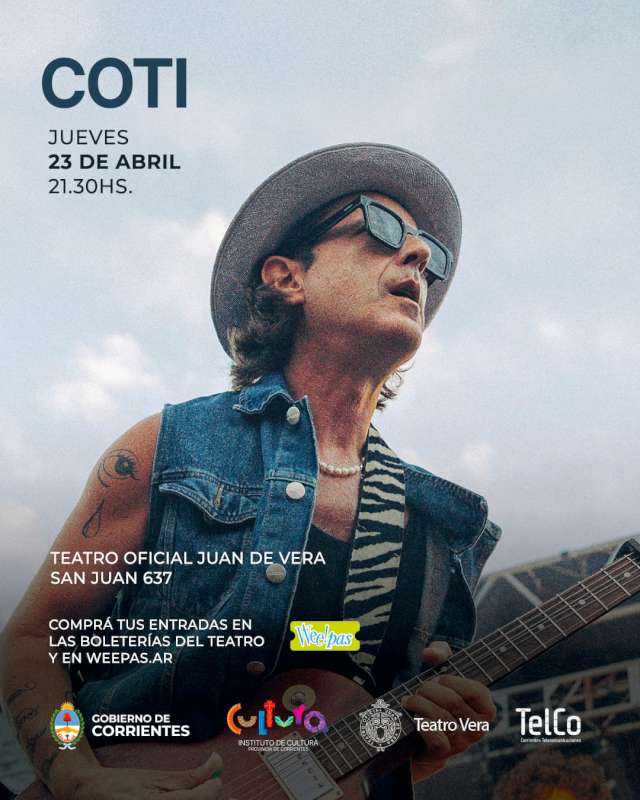 El reconocido cantautor argentino Coti se presentará este jueves 23 de abril, a las 21,30 hs. en Teatro Oficial Juan de Vera con un show imperdible que recorrerá los grandes éxitos de su carrera. Las entradas están en venta en weepas.ar/ y en la boletería del coliseo (San Juan 637), de lunes a sábado, de 9 a 13, y de 17 a 21.