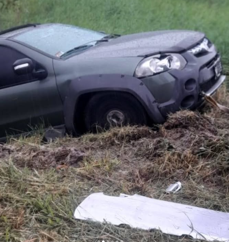 Tras el fuerte impacto, la Fiat Strada perdió el control y terminó a pocos metros de un canal de desagüe, mientras que la camioneta del funcionario quedó desplazada varios metros hacia la banquina, entre pastizales.