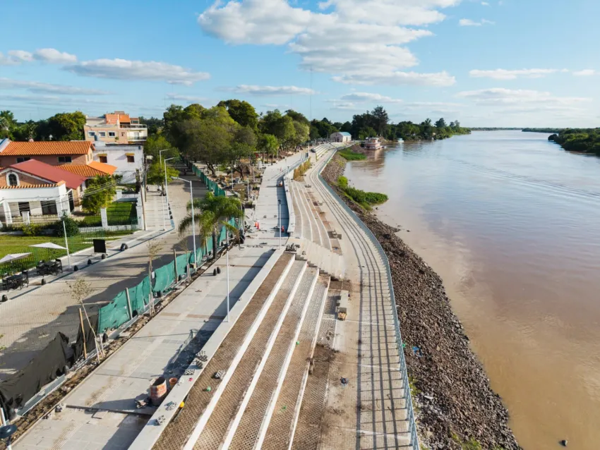 La flamante costanera se extiende a lo largo de casi 500 metros sobre la ribera del río Paraná, con un diseño moderno desarrollado en dos niveles. En la parte superior se ubica un paseo panorámico ideal para caminatas y actividades recreativas, mientras que el nivel inferior permite una conexión directa con el paisaje ribereño.
