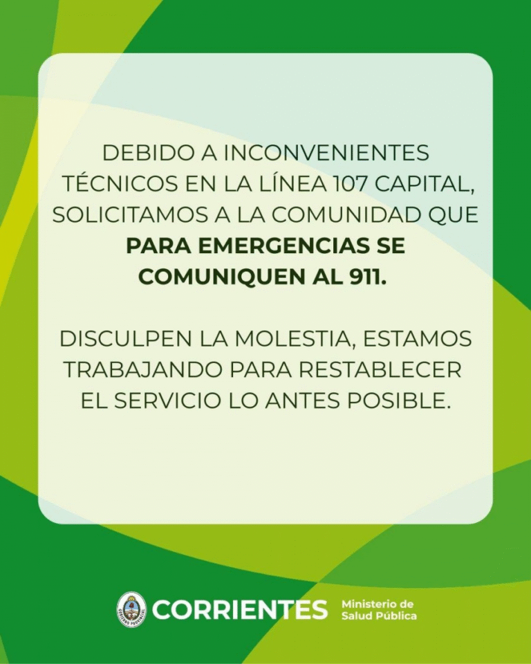 por Corrientes al Día El Ministerio de Salud de Corrientes informó que la Línea 107, utilizada para solicitar ambulancias y asistencia médica urgente, se encuentra momentáneamente fuera de funcionamiento en [...]